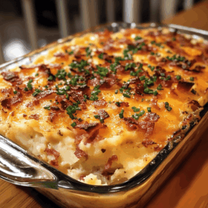 A creamy and cheesy casserole made with mashed potatoes, cheddar cheese, and crispy bacon, perfect for any gathering.