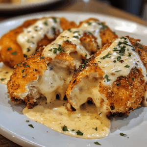 Chicken Pillows are a delightful dish featuring tender chicken wrapped in a flaky pastry, served with a rich and creamy Parmesan sauce.