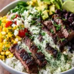 Assemble the bowls: In a lovely bowl, layer a generous scoop of lime-infused rice, top it with perfectly sliced steak, and then add black beans, sweet corn, and creamy diced avocado. Drizzle a liberal amount of the creamy cilantro lime sauce over the top.