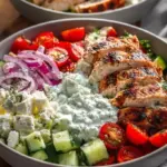 Assemble the Bowls: Start with a base of fluffy quinoa or tender rice. Top generously with sliced chicken, followed by a colorful medley of cucumber, tomatoes, and red onion. Crumble feta cheese over the top for that classic Greek touch.