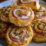Delightful and savory ham and cheese pinwheels wrapped in flaky puff pastry, perfect for gatherings or as a snack.