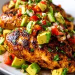 A vibrant dish featuring grilled chicken marinated in zesty lime and chili powder, topped with creamy avocado and fresh cilantro.