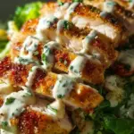 A creamy, tangy chicken dish enveloped in Caesar dressing and topped with Parmesan, promising a deliciously savory experience.
