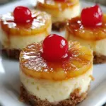 Indulge in these delightful Mini Pineapple Upside Down Cheesecakes, featuring a creamy filling and a crisp graham cracker crust, topped with caramelized pineapples and a maraschino cherry.