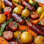 A delightful one-pan meal combining savory kielbasa and colorful roasted vegetables in a sweet honey garlic sauce.