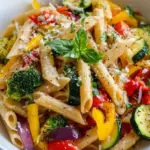 A colorful bowl of Vegetarian Pasta Primavera with fresh vegetables and herbs